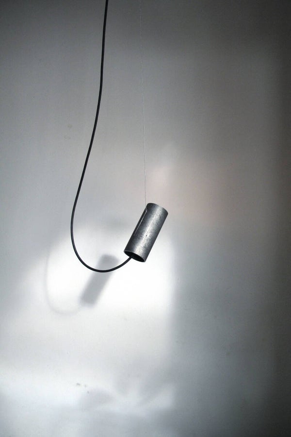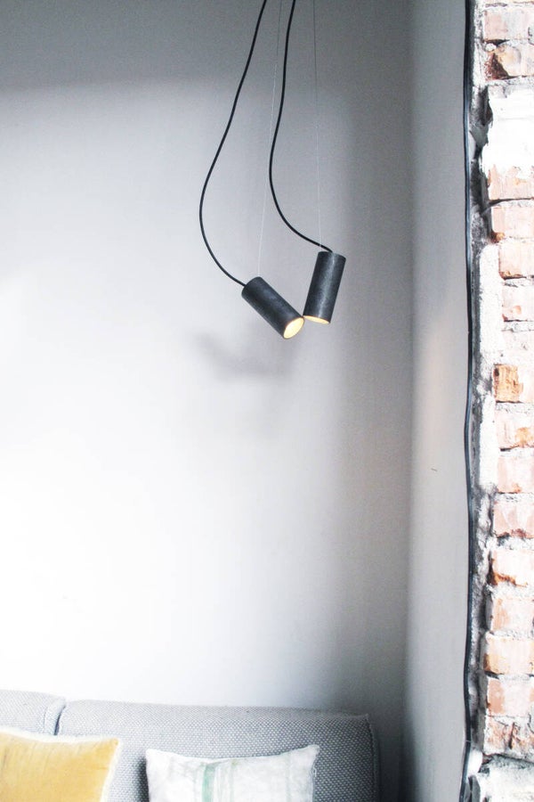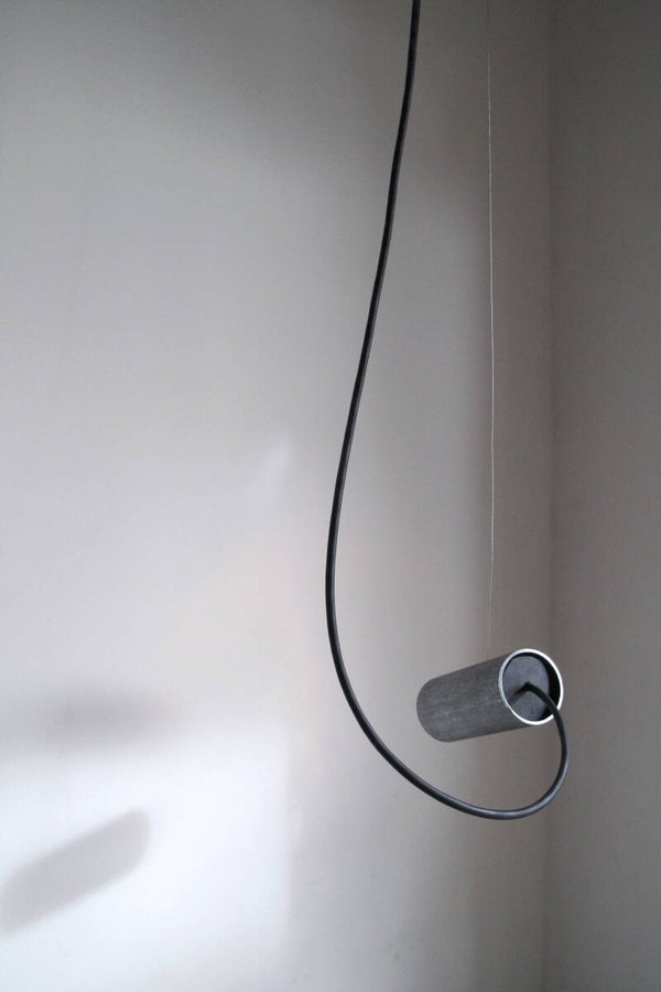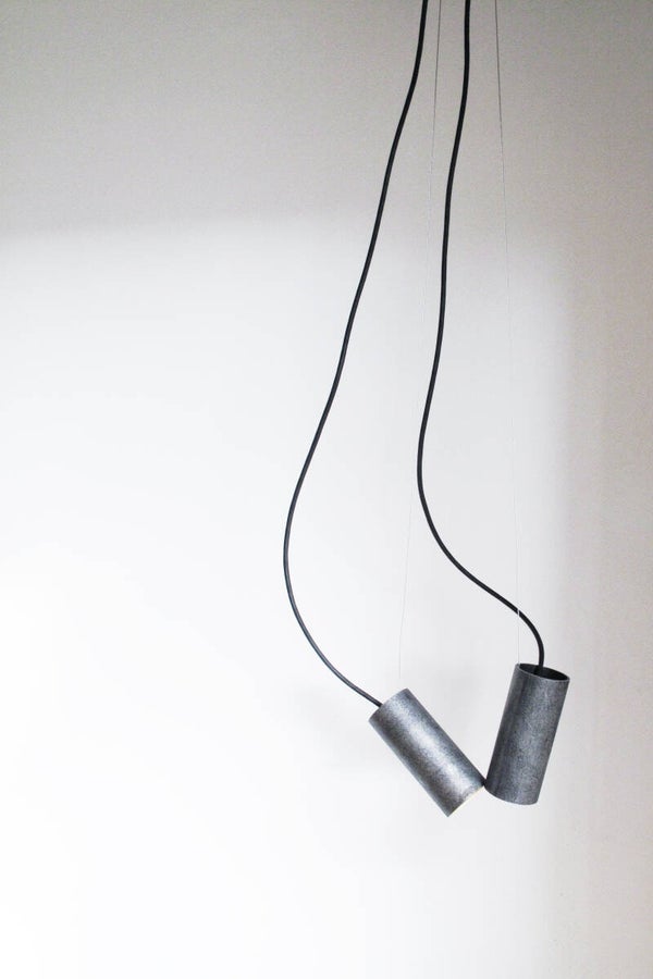 These tubular lamps are like little creatures, communicating with light. The double version talks to each other, their lights facing; or you can make the single version face away, addressing the wall, the floor or the ceiling instead. Their cords resemble long tails, dynamic and elastic but also frozen in space – as if a mischievous fairy caught them off guard, and set them in stone.