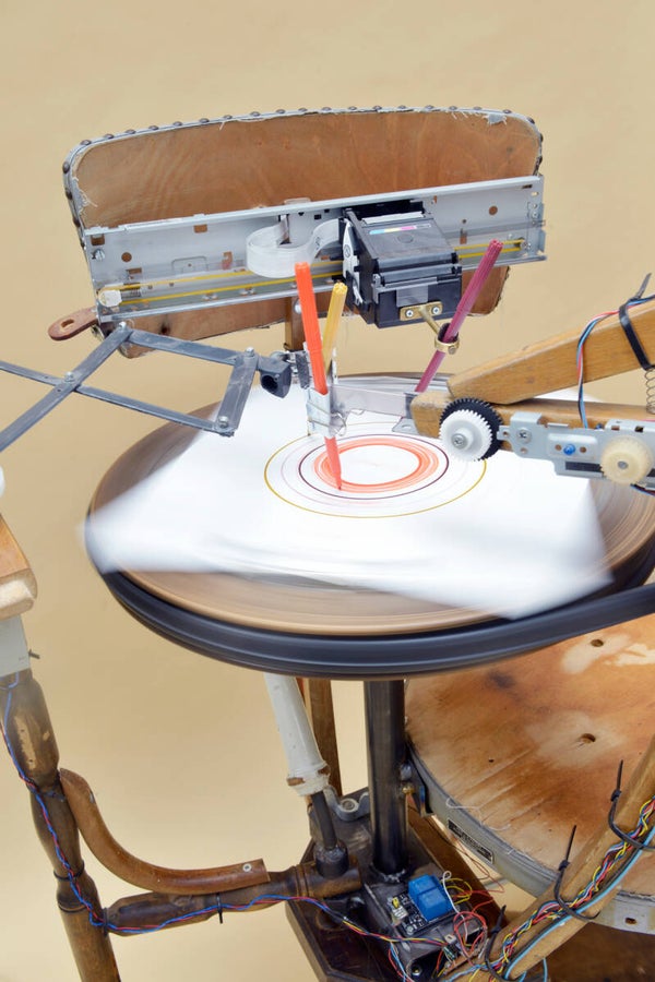 Discarded desktop printers, a spinning wheel and a cast-away chair form the basis of this machine, a machine that honours its printing ancestors by doing something altogether new. As the operator you feed it ink and paper and manipulate its settings, and the machine produces a drawing in response. The drawings may resemble the scratch work of an angry abstract expressionist, the detailed renderings produced by a 3D-scanner, or painstaking spirographs reminiscent of childhood. Each drawing is unique; the machine is incapable of copying itself. Challenging the traditional distinction between human volition and machine docility and muddying the waters of authorship, the Drawing Machine produces more than ink-on-paper artworks: it produces a new relationship to technology. This new relation is one not of control, but of surrender and surprise.